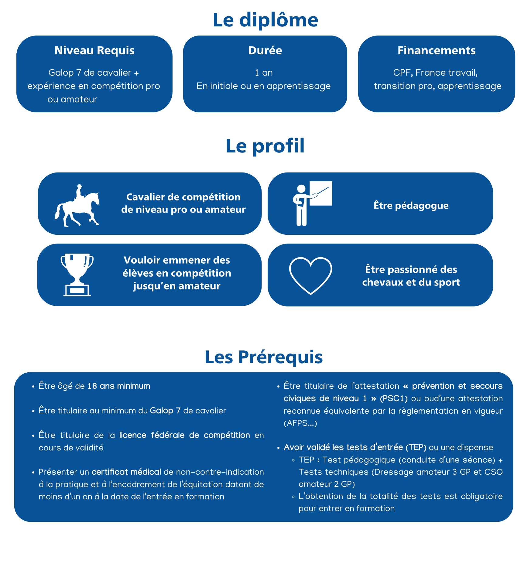 Il s'agit d'un diplôme de niveau 5 enregistré au RNCP 39573 et considéré de Catégorie 3 "enseignant" dans la Convention Collective étendue du personnel des centres équestres.